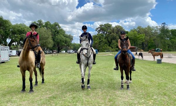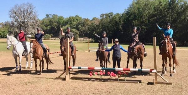 Dressage queens successfully finishing their first jumping group lesson with Shandiss McDonald (2018).
